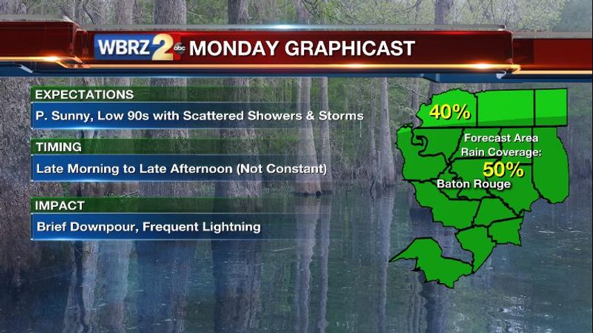 Forecast Discussion: A slight weakness between two upper ridges, in the Southeast and Southwest, will be just enough to maintain status quo pop-up thunderstorms through the beginning of the week. Areal coverage will be in the 30-50% through the period with action trailing off somewhat through time. Most of the development will be driven by daytime heating so the daily window will be from 11am - 5pm. By the week end, there are signs of a returning ridge overhead, capping off convection and sending temperatures back above average-- possibly for some of the hottest readings so far this season.