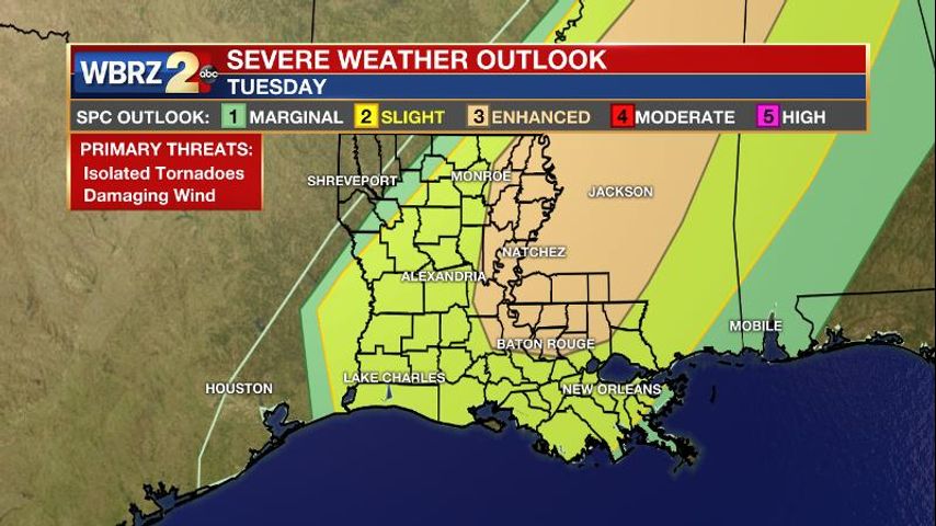 Today and Tonight: Once again, a mild afternoon is ahead with temperatures stretching for 80 degrees. Some sun early will give way to increasing clouds into afternoon with a few showers and thunderstorms possible. Then will come another round of potentially strong to severe storms. A squall line is expected to approach the area during the evening and overnight hours bringing with it the risk damaging wind gusts and an isolated tornado. As of 6am Tuesday, forecast models suggested most of the action occurs from 10pm – 2am. Mainly for that period, the National Weather Service Storm Prediction Center has outlined an “enhanced risk” for severe weather in the WBRZ Weather forecast area from I-12 northward and a “slight risk” south of that. Showers and thunderstorms are expected to wrap up from west to east by dawn Wednesday with temperatures dropping back to about 60 degrees.