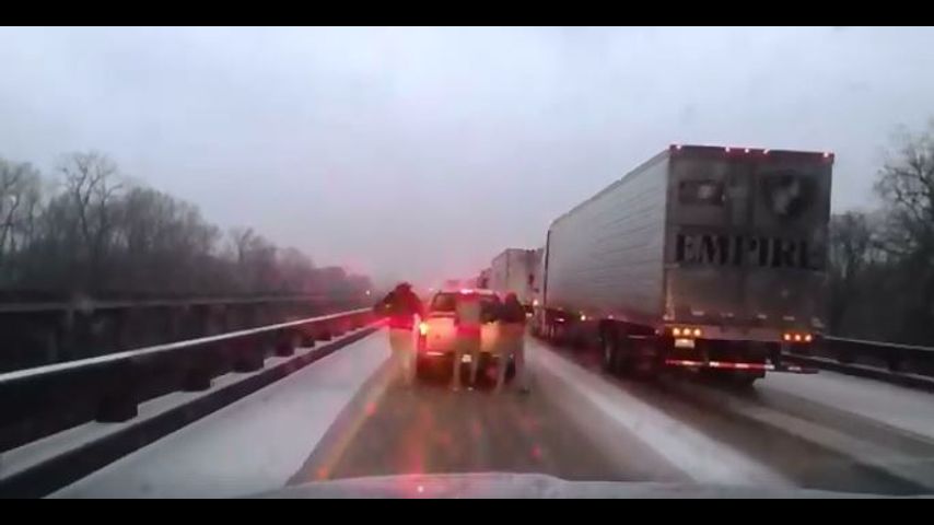 Video from Chris Serio's Facebook page shows the three slipping and sliding while holding onto the back of the pick-up; the video appropriately titled "I10 West Ski Resort."