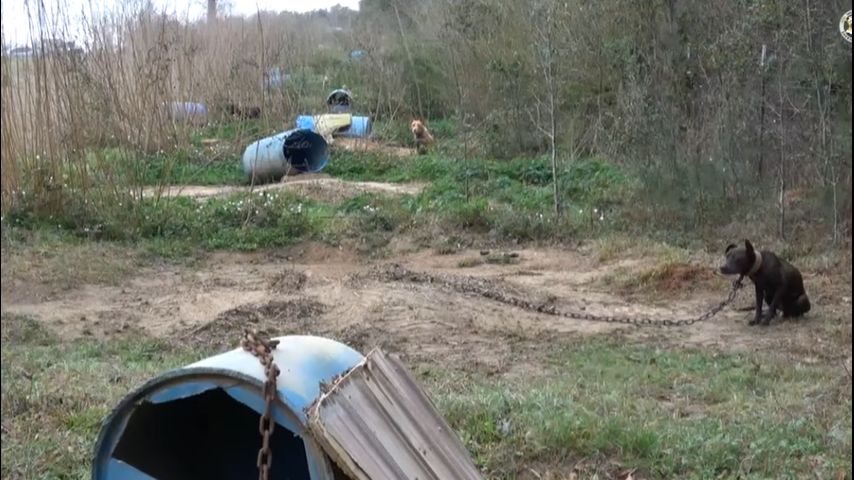 As detectives investigated, they found a property about a mile away from the event location and found 13 dogs chained to a line of poles surrounded by an electric fence. Most of the dogs, but not all, had only a plastic barrel for shelter and dirty water bowls; no food was found anywhere on the property as well, deputies said.