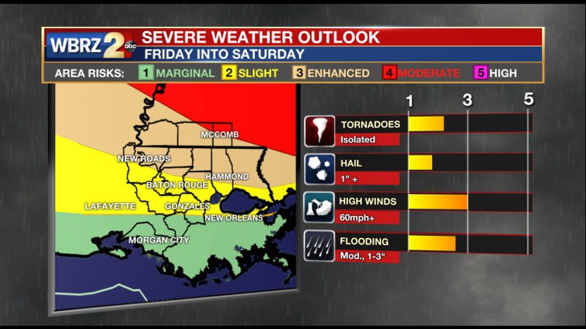 Reminder: With the threat for impactful weather—severe thunderstorms—please have access to alerts through Saturday. You can download or activate the WBRZ WX App on your Apple or Android device or turn on a NOAA Weather Radio for bulletins such as watches and urgent warnings. Of course, WBRZ, WBRZ+, and the Cable Weather Channel will have updates as active weather dictates.