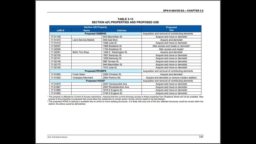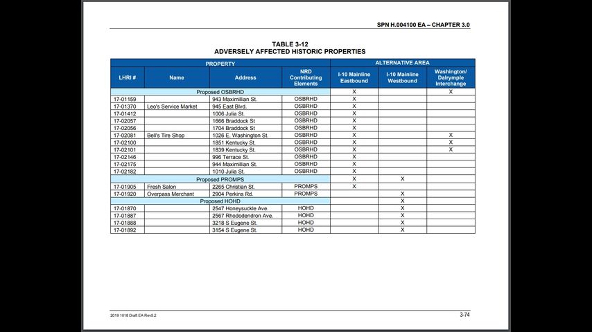 Historic homes were listed as being possibly purchased for demolition along Honeysuckle, South Eugene, Rhododendron and various Old South Baton Rouge addresses abutting the highway on Braddock, Maximillian, East Blvd., Julia, E. Washington, Kentucky and Terrace.