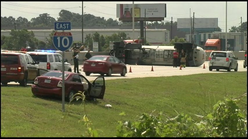 According to State Troopers, the tanker overturned after crashing with a car that had run off the roadway. The car over-corrected and entered back onto I-10, striking the tanker.