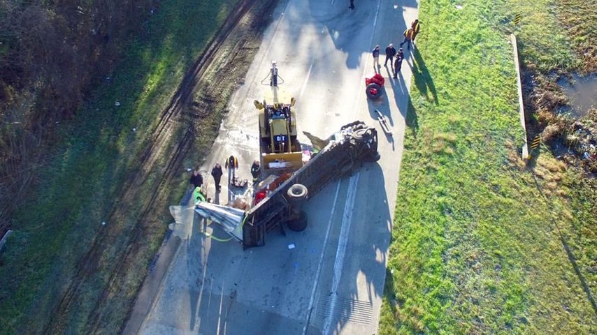 Lane closures remained in effect throughout the morning as crews worked to recover the vehicle and clear debris from the roadway. Spilled diesel and dumped cargo added time to the overall cleanup operations.