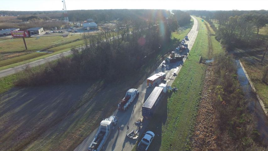The above aerial images were captured by a drone operator from Atmosphere Aerial. Paul of Atmosphere Aerial reported that he and the crew were stuck in the bumper-to-bumper traffic resulting from the overturned big-rig while on their way to a film shoot in New Orleans. Delays were bad enough that the crew had time to get out, put their drone up and capture some video of the overturned vehicle.