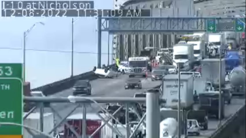 Traffic cameras showed the car flipped on I-10 east shortly before 11 a.m., with delays starting before LA-415. Two lanes on the Interstate were blocked as cleanup efforts continued.