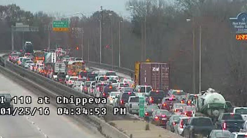 The center and right lanes of North I-110 remained blocked as of 5 p.m. with traffic passing through in only the left lane. They were announced back open just a few minutes later. The queue related to the accident at this time had spanned past Florida Street.