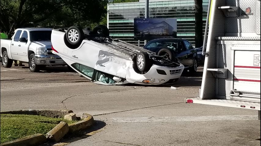 The crash was reported around 5 p.m. at the intersection of Bluebonnet Boulevard and Highland Road. Photos from the scene show an overturned car that appears to have been t-boned.