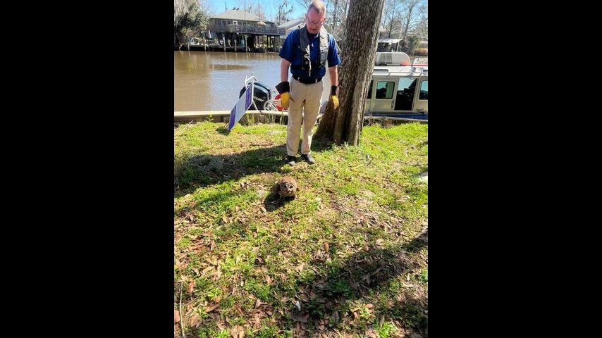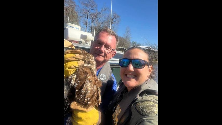 Livingston Parish deputies worked with Louisiana Department of Wildlife and Fisheries agents to get the owl down. Pictures showed the owl hanging upside down, with its talon caught in the line. Officials said the animal was hanging over a river, 15 feet in the air.