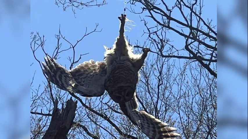Owl stuck in fishing line hanging from tree rescued Sunday