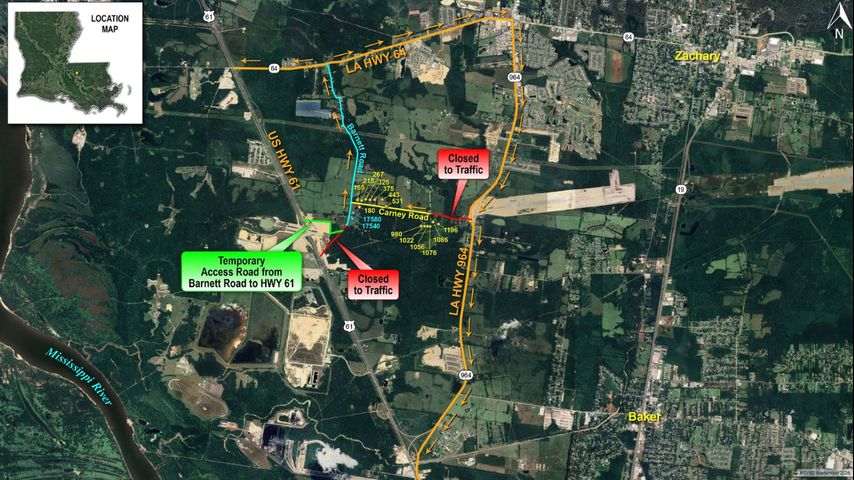 Residents traveling on Barnett and Carney roads will be detoured north to LA Highway 64 via Barnett Road and should plan alternate routes. They will, however, be allowed to use a USACE temporary construction access road connecting Barnett Road and U.S. Highway 61 during emergencies.