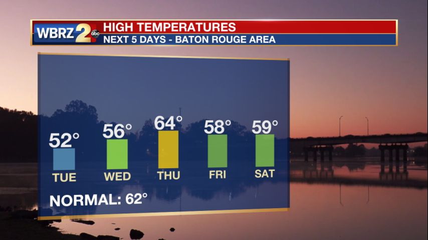 Up Next: Overnight lows will be frosty heading into Wednesday, but temperatures are climbing. Wednesday highs will be in the upper 50s and Thursday temperatures will be in the 60s. Late on Thursday, a weak boundary will move through the area. It may spark up some isolated showers overnight, but the rain chances are low. It will bring in more cold air as well. Temperatures on Friday will be back in the 50s. Click here to see the 7-day forecast.