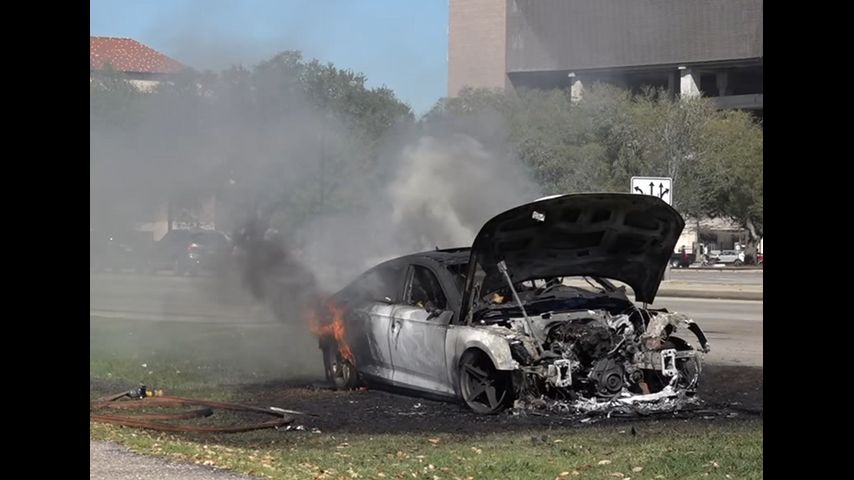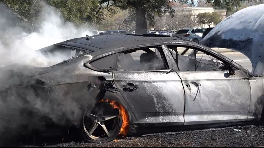 Video showed the formerly-white car had been charred and one of the back wheels still was on fire. Door handles were melted.