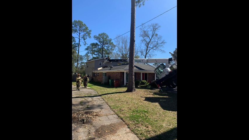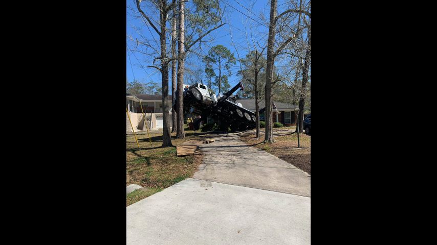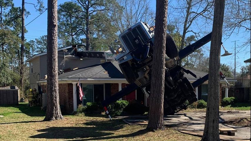 The Slidell Police Department said the crane, which was mounted to a semi-truck, fell onto a house in the Palm Lake subdivision. Photos shared by the department showed the crane arm going through the roof of a two-story home.
