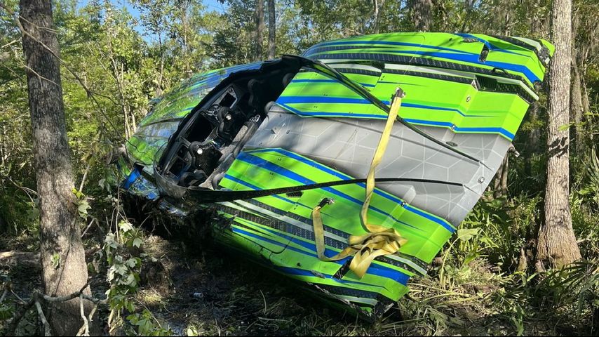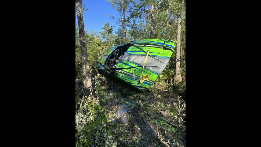 The wreck happened around 5:30 p.m. Sunday. According to the Department of Wildlife and Fisheries, five people were on board the luxury boat when it took a sudden turn and crashed through several trees.
