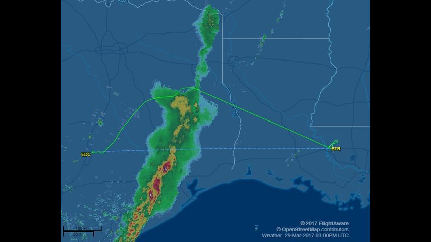 The flight path shows the plane had to fly north and around a line of severe weather that is moving from Texas to Louisiana.