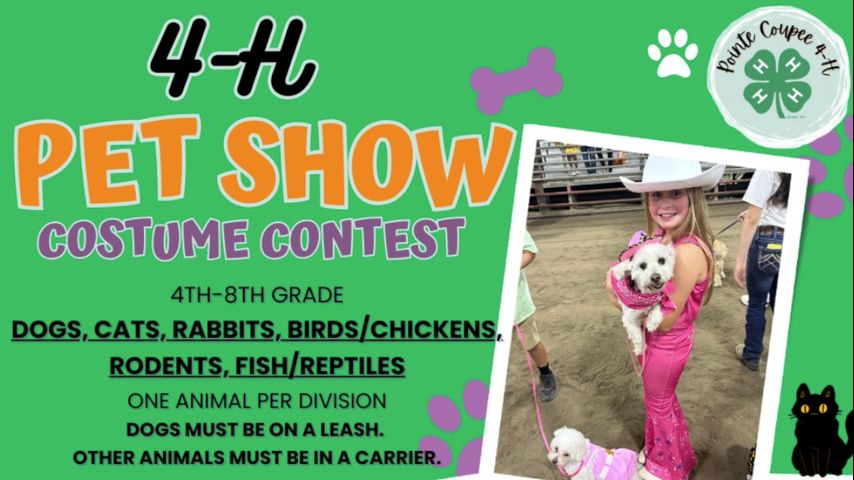 The Pointe Coupee 4-H Club is hosting a pet show costume contest on Tuesday for 4th through 8th graders and their furry — and scaly — friends.