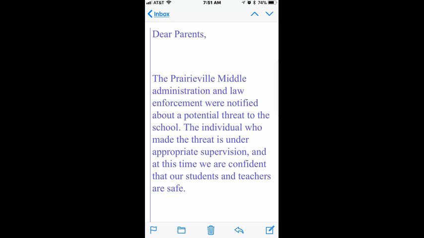 In a note to parents, administrators said they were “notified about a potential threat to the school. The individual who made the threat is under appropriate supervision.” In the message, school officials said they were confident campus was safe.