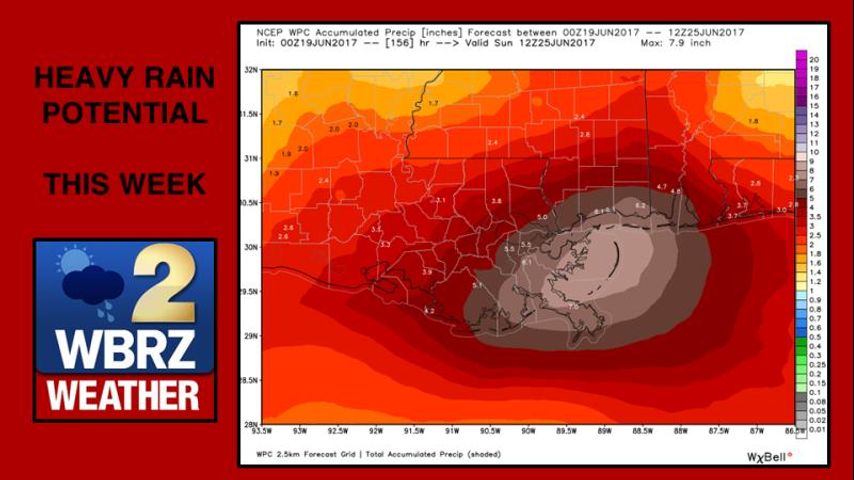 Statement from the National Weather Service: "First, a broad area of low pressure situated near the Yucatan Peninsula is currently being closely monitored for potential tropical cyclone development in the next few days. Second, a cold frontal zone is draped from the eastern United States into the Gulf Coastal States and is in the process of becoming stationary over the forecast area. Third, a very large region of deep tropical moisture in the southern Gulf of Mexico and western Caribbean Sea will be advancing northward during the next 24 to 48 hours, reaching the central Gulf States area by later tonight into Tuesday. These three ingredients combined favor heavy rainfall potential that could see storm total accumulations easily range from 3 to 6 inches over a 2 to 3 day period across a large portion of southeast Louisiana and southern Mississippi. There is also a potential for much higher accumulations in the 10 to 16 inch range if the system in the Gulf does move closer to the central gulf coast region during the week. At this time, it should be strongly stated that there is a large degree of uncertainty on actual rainfall accumulations at any particular location. There is a fair degree of confidence that this weather pattern is conducive to heavy rainfall. The heaviest amounts could easily remain over the near coastal waters, but could also occur over land areas close to the coast. There is also moderate confidence in the timing of heaviest rainfall likely to take place over a 2 to 3 day stretch beginning late Monday night and continuing through Thursday night. The Weather Prediction Center rainfall forecasting branch is indicating a MARGINAL RISK of excessive rainfall generally over a large portion of southeast Louisiana to include the Baton Rouge metro area, the areas generally north and west of the tidal lakes. There is a SLIGHT RISK of excessive rainfall over coastal Mississippi and the extreme eastern portions of southeast Louisiana to include the greater New Orleans metro area."