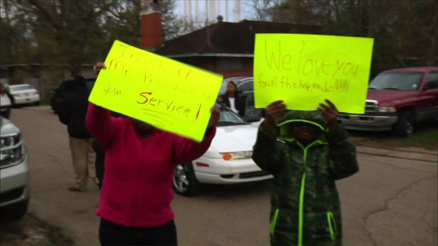 People along the motorcade route below the interstate were happy to be stuck waiting. More than 100 people in the neighborhood around McKinley stood in the chilly morning air to wait for the motorcade to pass. People held signs which said "Yes We Can" and "We Love You Obama," and some left their cars on the side of the road to walk over for a closer picture of the motorcade and perhaps a glimpse of the commander-in-chief.