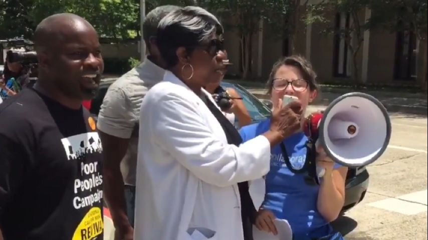 Fifty people with the #PoorPeoplesCampaign protested at the State Capitol and in downtown Baton Rouge this afternoon. Organizers say 9 were arrested for obstructing traffic. National group specifically protesting “immoral” budget by #lalege #wbrz #lagov pic.twitter.com/rTVMptt5w0