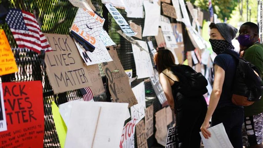 Signs used during the protest have been attached to the newly constructed barricade in Lafayette Park facing the White House. The site has now become a makeshift memorial to black Americans unjustly killed by the police.