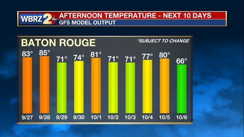 Looking Ahead: The weekend will end out sunny and dry with highs in the mid to upper 80s. The big pattern change will come on Monday when we get our first real cold front of the season. The timing will be slightly adjusted as we get closer in time, but as of now the front will move through the area late in the day on Monday. Ahead of the cold front, there will be scattered showers and thunderstorms with the chance of one or two becoming strong. There's low confidence in the chance for severe weather, so it's something we will have to keep an eye on. Here's the most exciting news - behind the front, cooler air will filter into the area knocking our low temperatures down into the 50s and highs in the 70s! Hello Fall! We'll even have a second front arriving late week, that will re-enforce that cooler and drier air.