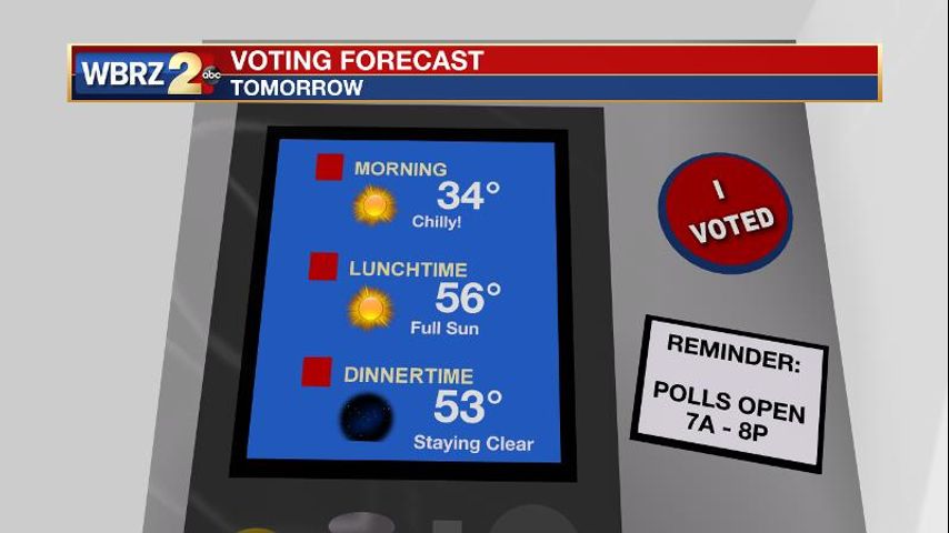Up Next: Weather will not be an excuse to skip the voting booth! Sunshine will quickly warm thermometers on Saturday. Ample sunshine is expected through the day with highs near 60. Overnight will again be chilly with lows in the mid 30s.