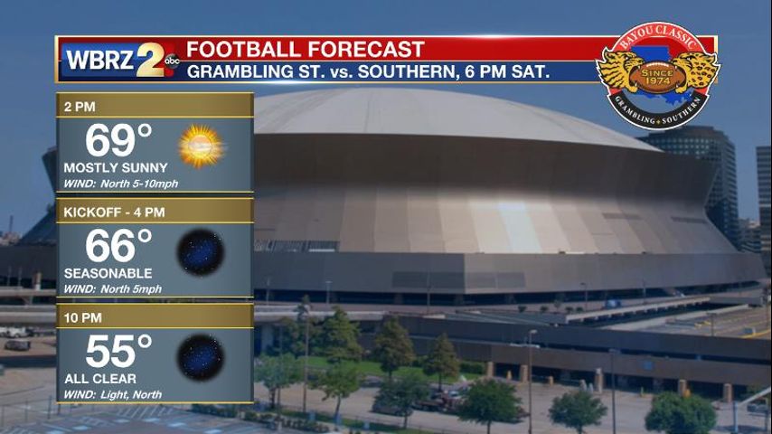 Up Next: Saturday and Sunday will remain mostly clear with just a few high clouds at times, highs in the low 70s and lows in the low 40s. The Bayou Classic in neighboring New Orleans will feature similarly pleasant weather. Into next week, a storm system will offer rain and potentially strong storms by Tuesday followed by much colder air.