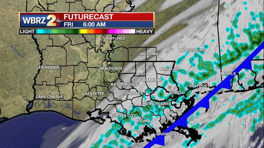 Next 24 Hours: As a cold front pushes through tonight, slightly drier air will spill into the region. Winds shifting northwest will allow low temperatures to back down into the mid to upper 50s. On Friday, some sun will be available, but a warm front is expected to lift through the area. As this occurs, clouds could increase at times and a stray shower is even possible—especially south and east of Baton Rouge. The high temperatures will make it into the upper 70s.