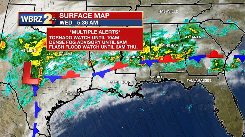 A *DENSE FOG ADVISORY* has been issued until 9am for areas south of I-12. Expect reduced visibility commuting southward toward New Orleans and the Louisiana Coast. Reduce speed and use low beam headlights.