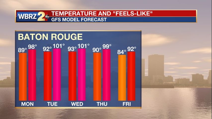 Tonight and Tomorrow: Lingering showers tonight will dry out by 8 PM, leading to mostly cloudy skies through this evening. There is a slight chance of a brief drizzle near St. Mary Parish between 8 PM and 10 PM tonight. Muggy conditions will stick around, as temperatures will be slow to cool near 74° overnight. Clouds will break slightly Monday morning, as spotty showers accumulate along the coast through the early afternoon hours. These showers will move from southeast to northwest through the late afternoon, but will be breaking up as they get further inland. Best chances for experiencing a brief, cooling shower will be between 4 PM and 6 PM. Temperatures will be reaching into the 90s by 1 PM, as we reach a high of 92. Moisture within the atmosphere will make it feel even warmer, with heat index values hovering around 100 to 101 between 1 PM and 4 PM.