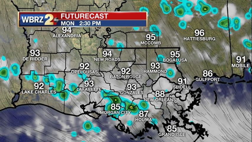 Up Next: Spotty to isolated showers and storms through much of the week, as highs stay in the low to mid-90s. Rain chances increase over the weekend, as highs approach 90° Sunday.
