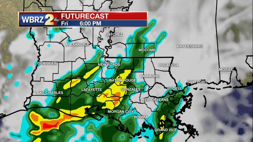 Today and Tonight: Clouds will increase quickly on Friday with temperatures making it into the upper 60s. Showers are expected to develop as early as afternoon, with a chance for rain and thunderstorms through Saturday Morning. This does mean that Friday Evening outdoor events like LSU Baseball will need to be wary of rain. All indications from high resolution future radar are that the highest rain chances will be between 6pm – 2am.