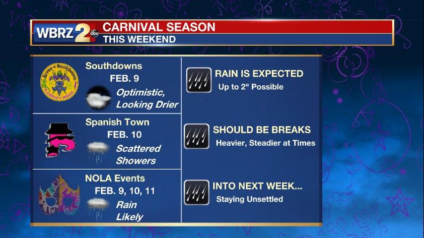 An extended unsettled weather pattern will kick into gear on Friday. Periods of rain may affect many of the Mardi Gras events scheduled for the weekend in both Baton Rouge and New Orleans