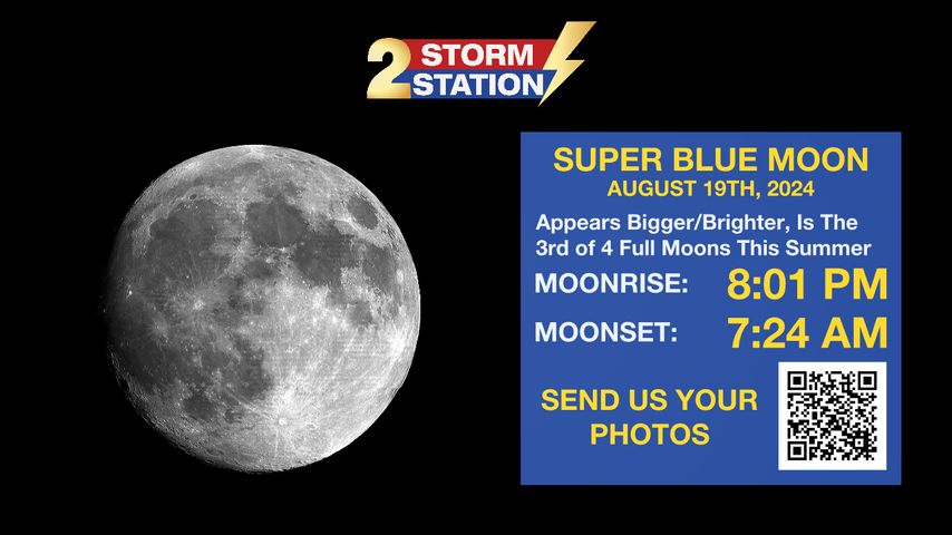 The reason the event is rare: the combination of a super moon and blue moon don't always overlap. This happens once every 10-20 years, on average. The moon will rise at 8:01 pm Monday night, and set at 7:24 am Tuesday morning.
