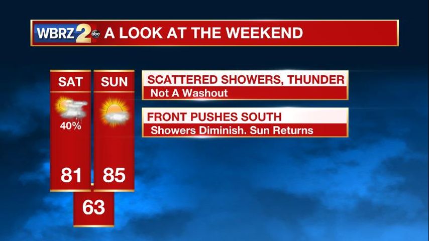 Up Next: The chances for rain on Saturday have diminished each day through the week. A weak cold front will move across southeast Louisiana and southwest Mississippi. Due to this, it will likely take daytime heating to help trigger showers. Still, only isolated to scattered activity is anticipated, and a washout is not likely. Some locations, especially south and east of Baton Rouge, could miss out on rain entirely. If you have outdoor plans, be ready to dodge but not cancel. The cold front should move south and east of the area on Sunday allowing for a drier second half of the weekend. Temperatures will only drop by two to four degrees behind the front, but humidity should be reduced through early next week.