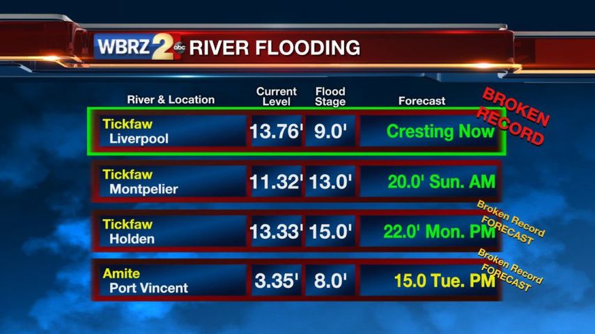 The Lower Mississippi River Forecast Center has indicated that many rivers are forecast to potentially break records through the next several days. The Tickfaw River at Liverpool has ALREADY broken a record, however thankfully it is cresting now.