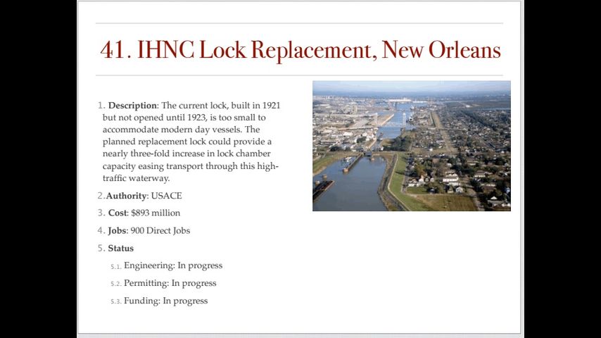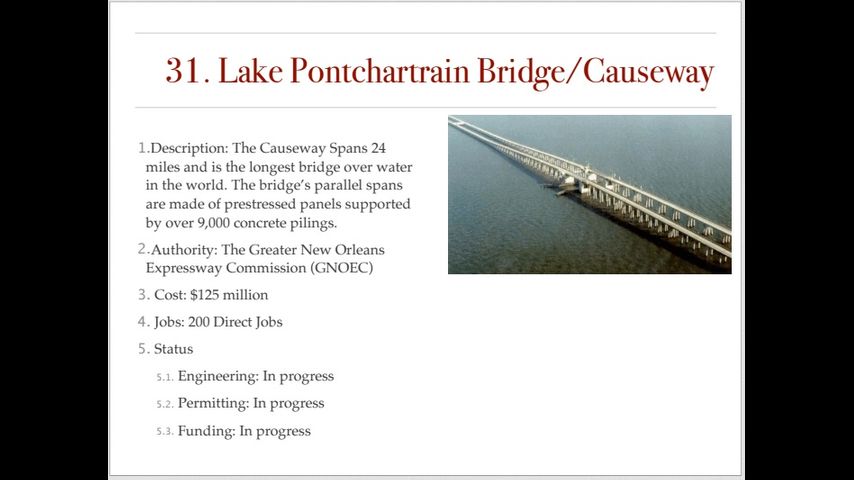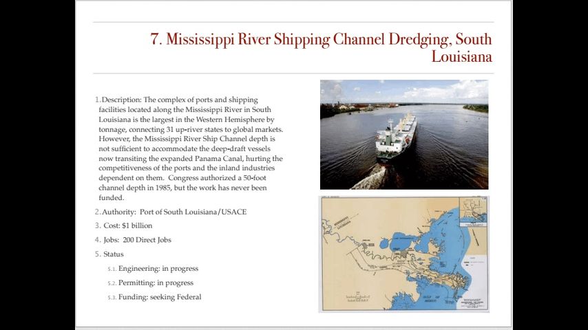 In a priority list of projects the Trump team put together after Donald Trump's November election, dredging the Mississippi was highlighted as a possible project along with replacing the lock on the Industrial Canal in New Orleans and work on the Causeway connecting either side of Lake Pontchartrain. More than $2 billion would be spent on the projects in Louisiana and would create about 1,300 jobs, according to the report uncovered and published by newspaper conglomerate McClatchy.
