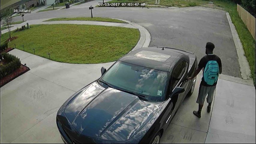 Photos from the same neighborhood shows another attempted burglary as a man checks for unlocked vehicles around 7 a.m. on July 13.