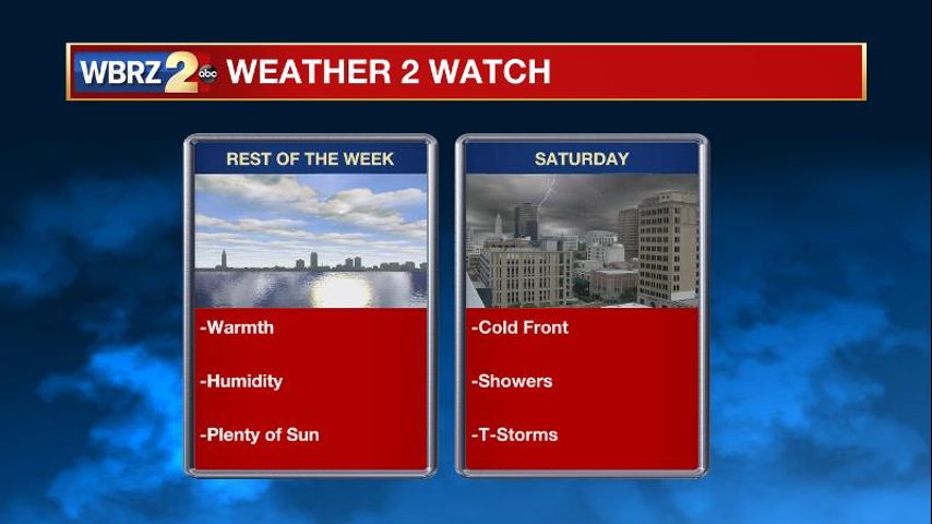 Up Next: Continued southerly winds will result in a bit more stickiness through the end of the week. Skies will be partly sunny with rain chances almost zero. Highs will be in the mid to upper 80s with lows in the upper 60s. Into the weekend, a cold front will approach the Gulf of Mexico. Since this system will move slowly, rain chances are expected to be elevated on Saturday. Thunderstorms are likely as well, but severe weather is not a big threat as it looks right now. If this front can progress south or dissipate, weather for the second half of the weekend could shape up to be nice.