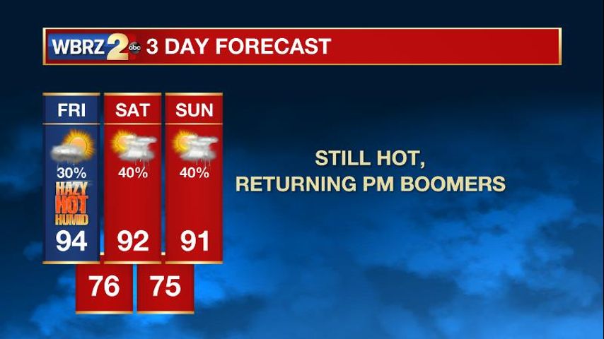 Thursday, Baton Rouge area thermometers stretched to 97 degrees, making it the highest high so far in 2017. As we pick up some of the hottest temperatures of this summer, heat illness can set in rapidly so be sure to hydrate. Also, when the sun is shining, burn times will be under 15 minutes so lotion up!