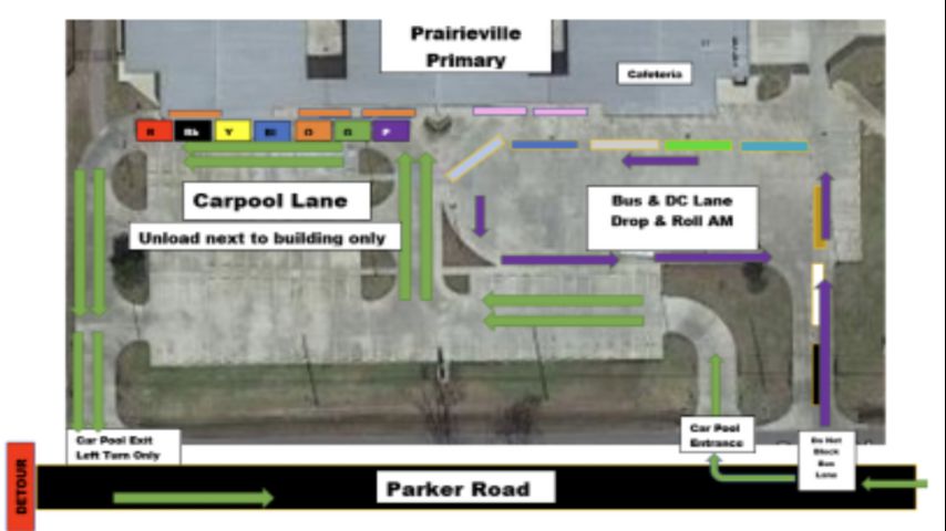 "Detours are labeled on surrounding streets such as La Rochelle/Fountainbleu, Hwy 929/ Abby James/ Hwy 44, and Hwy 42. We ask for your patience and understanding as we navigate our school buses, carpool, and daycare van transportation. Please expect delays. We are working with the district planning team and Ascension Parish Sheriff’s office to improve our methods. To help us expedite carpool and the loading and unloading of buses, please follow the procedures below."