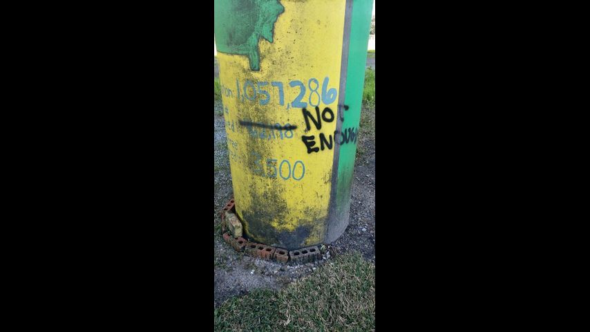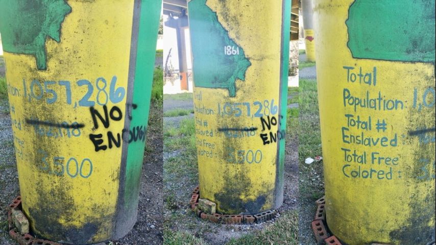 The vandal used spray paint to cross out the words "Total # Enslaved" and replaced it with "Not Enough."
