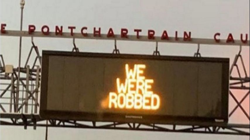 WWLTV tweeted a picture of a sign on the Pontchartrain Causeway that communicated just that, "We were robbed!"