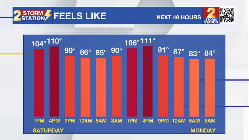 A *HEAT ADVISORY* is in effect from 11am to 7pm Saturday and Sunday as feels-like temperatures up to 112 are expected across the entire Storm Station Forecast Area. Hot temperatures and high humidity may cause heat illnesses. Drink plenty of fluids, and when possible, stay in an air-conditioned rooms, avoid afternoon sun, and check up on relatives and neighbors.