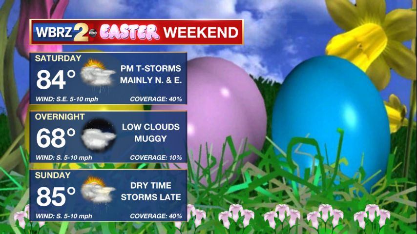 Up Next: Easter Sunday waking up to some lingering clouds and sticky conditions. You could see a sprinkle of rain in the early morning hours with temperatures in the low 70s. Higher dew points hanging around but the chance for showers is mainly in the evening hours. As a cold front moves through the area, showers and thunderstorms are expected. A few storms could produce gusty wind or hail. The rain should not put a damper on any of your Easter plans but have an indoor option for any afternoon events. Check in with the Storm Station for the must updated timeline on Sunday rain. Monday morning a couple of those showers could stay around into the overnight hours. As we head into next week we will begin to see a more seasonal trend in temperatures and some drying out. Click here to see the 7-day forecast.