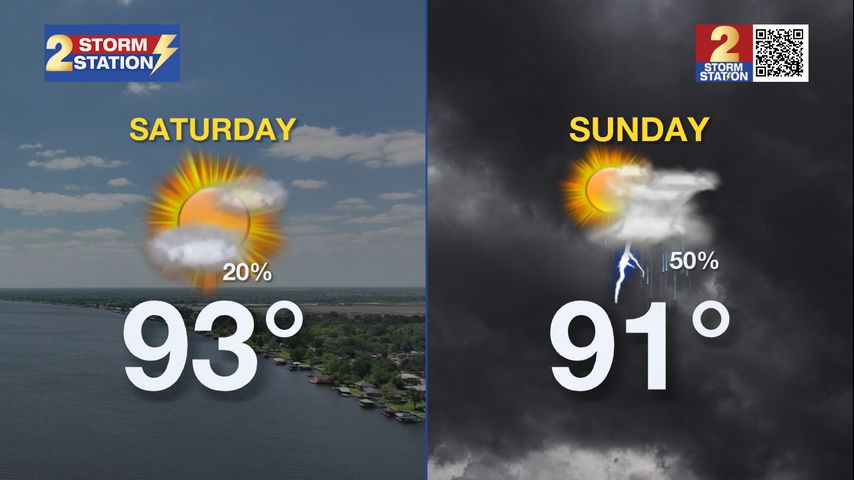 The Weekend: Pop-up showers and storms will linger through the weekend, but activity is set to ramp up Sunday. This afternoon, only spotty storms are expected, so most areas will stay dry. By Sunday, coverage increases to scattered, giving a good portion of the area a shot at measurable rain. Both days could bring heavy downpours, frequent lightning, and gusty winds with any storms. Highs will reach the lower 90s, with overnight lows in the mid-70s.