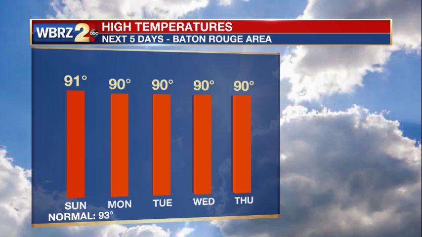 Up Next: Sunday is a copy and paste forecast. Temperatures waking up will be in the mid-70s across the area with mostly sunny skies. Moisture will be hanging around the forecast, and as temperatures heat into the low-90s shower activity will increase. Most people will be able to dodge these showers, especially if you have the WBRZ WX App. By the evening hours, radar will calm down and temperatures will fall back into the mid-70s overnight. Monday, unfortunately, the rainy pattern is set to repeat. We will be waking up to temperatures in the low-70s feeling sticky. Throughout the day temperatures climb into the low-90s. As temperatures rise, rain chances go up. Showers and storms make their way out of the area by the evening hours leaving us with mostly clear skies overnight. The same pattern repeats for the rest of the week. Click here to see the 7-day forecast.