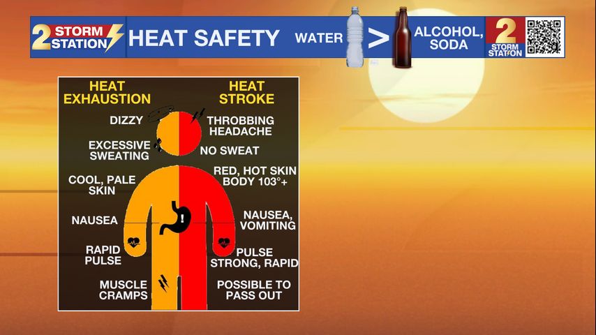 Up Next: Sunday will feature more of the same. Highs will top out in the mid-90s with humidity in full force. This will keep afternoon feels-like temperatures over 100° at times. Again, be sure to stay hydrated and be on the lookout for signs of heat illness.